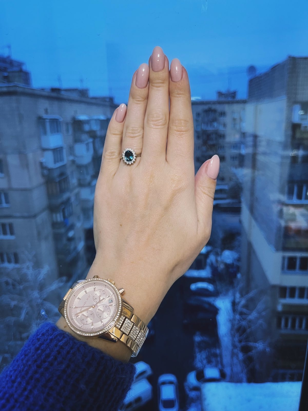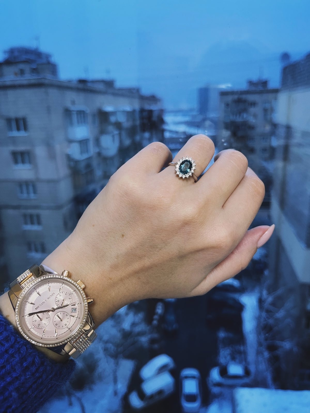 The central part of the ring is decorated with a massive blue oval-shaped stone. Around him is a scattering of sixteen elegant white pebbles. The inserts are articulated with each other using original fasteners, which enhances their aesthetic perception of the stones.