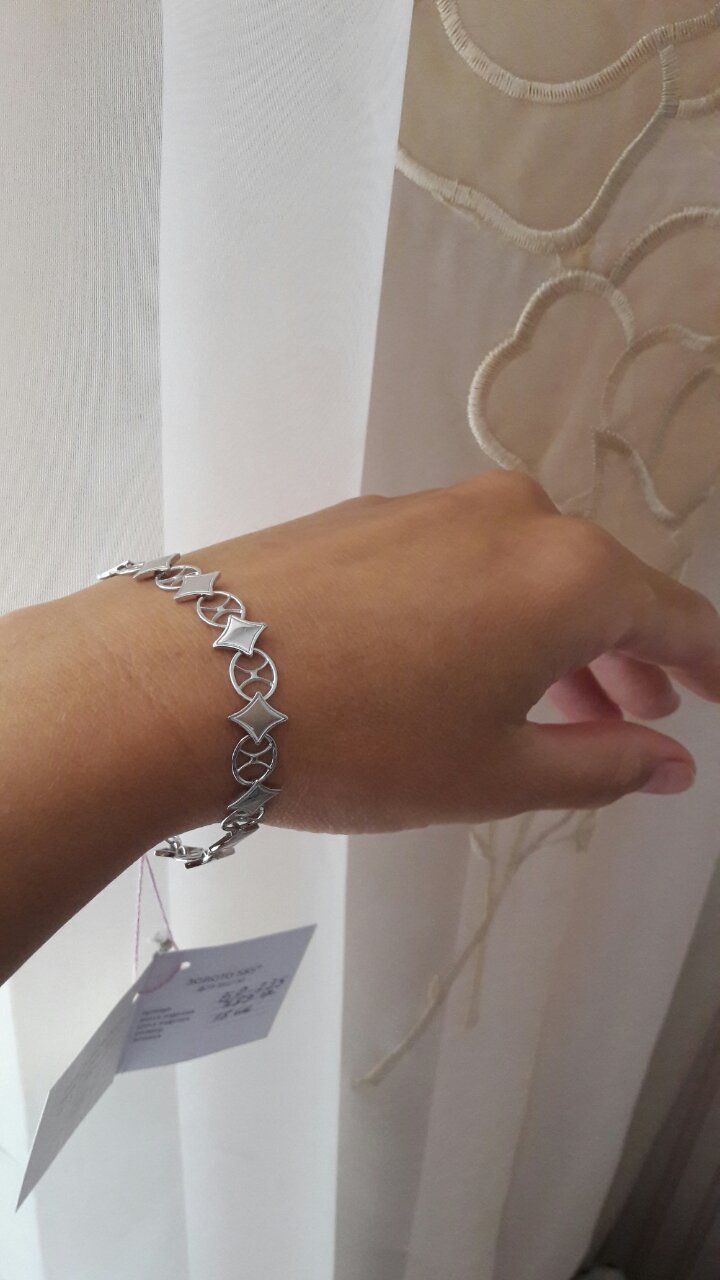 The length of the flexible bracelet with rhombuses and stones can be any (from 14 cm), the width is 15 m, the weight of the finished product is 8.76 g. You can make a bracelet in one color of gold and without stones.