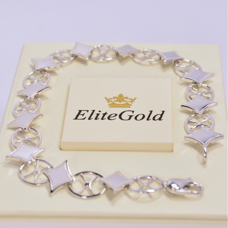 Elitegold jewelers offer a flexible bracelet that will delight all lovers of classic style. The composition is based on the alternation of geometric shapes - rhombuses and ovals. Along the perimeter of the rhombuses, a thin edging is applied, giving the figure more expressiveness. At the intersection of two thin golden lines of the oval, there are graceful round inserts in the amount of 11 pieces (white in the photo). The figures can be made of gold of various colors with a glossy surface.