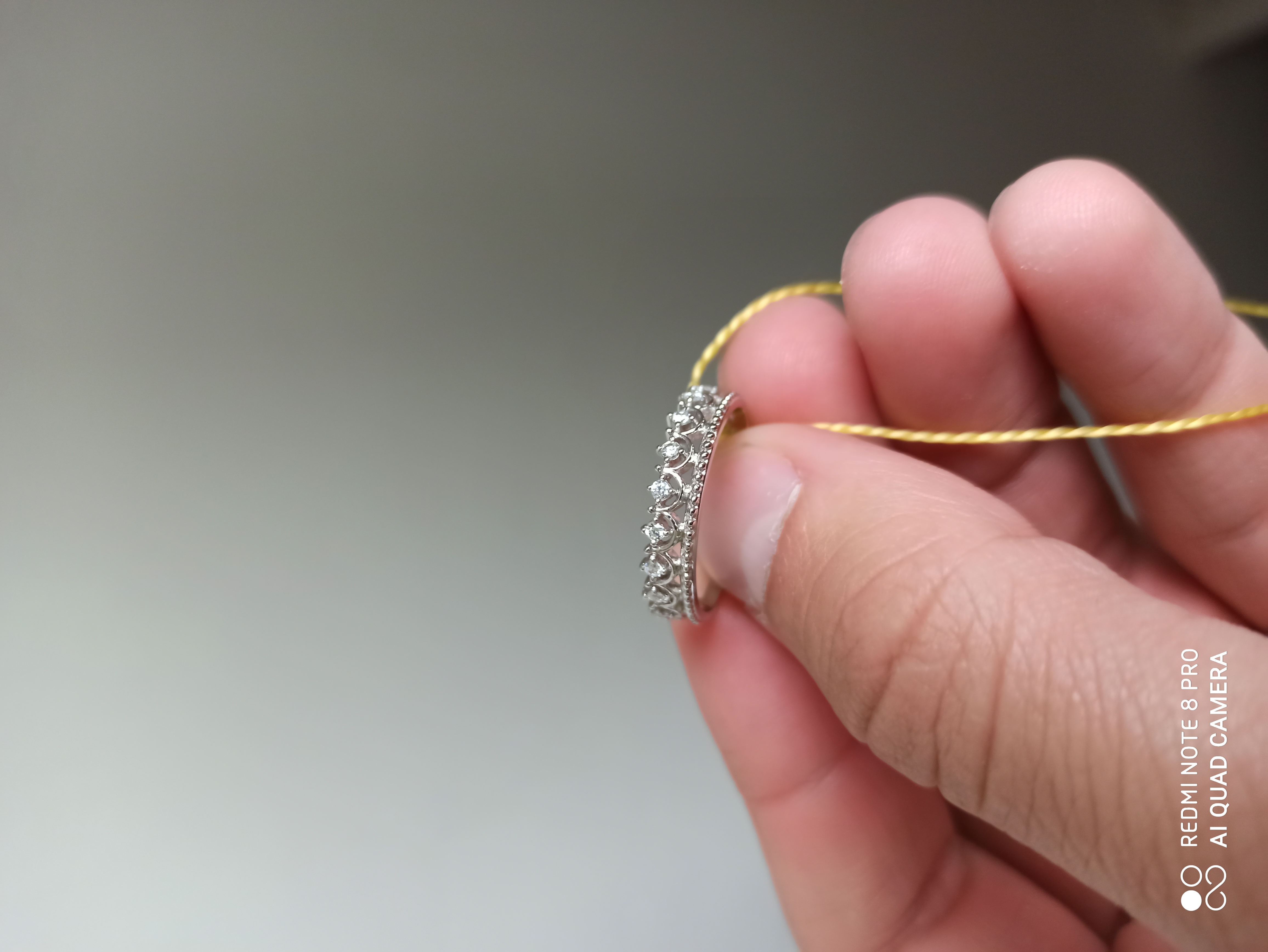 The thin glossy rim of the product is decorated with round gold balls on the front - it is the basis of the crown. On it are original semicircles-teeth with round pebbles (13 pieces) inside in faden setting. Want to give a gift to your loved one? You won't find a better option!