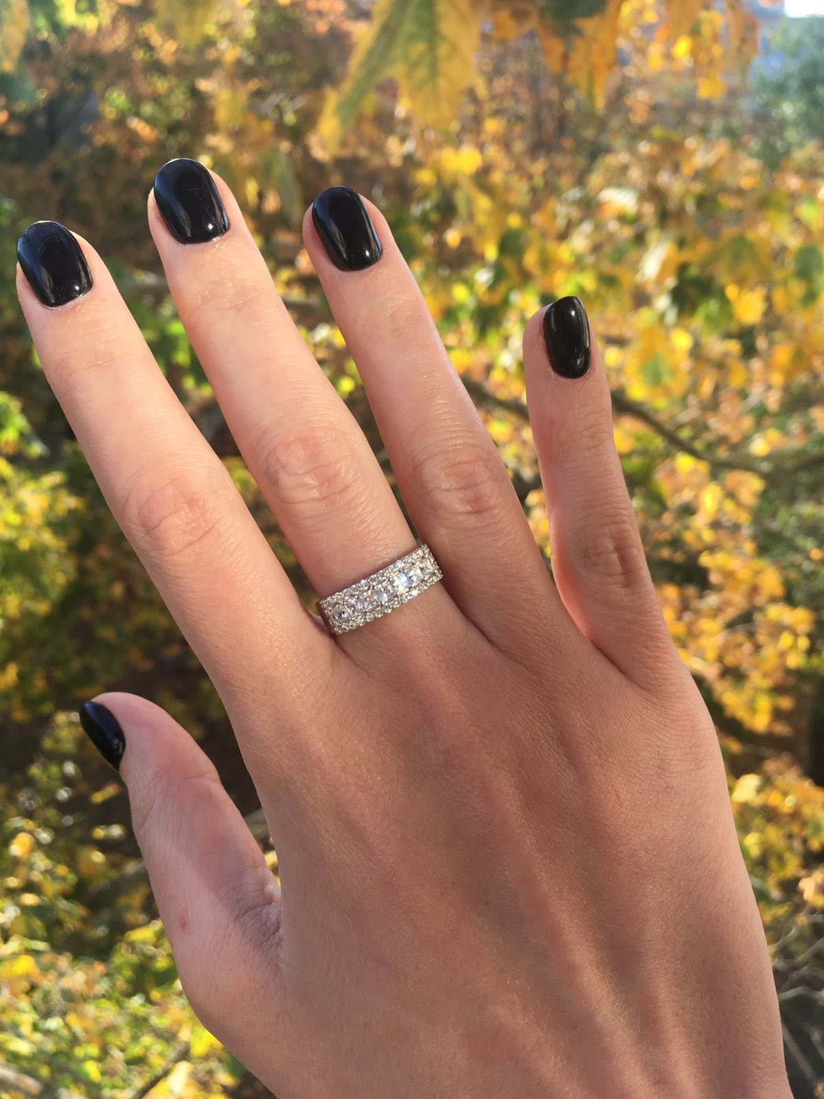 The central part of a fairly wide rim (9 mm), made of white gold with a glossy surface, is decorated square and round white inserts in faden tacks. Seven square stones surround thirty-two round-shaped inserts.