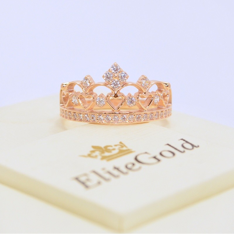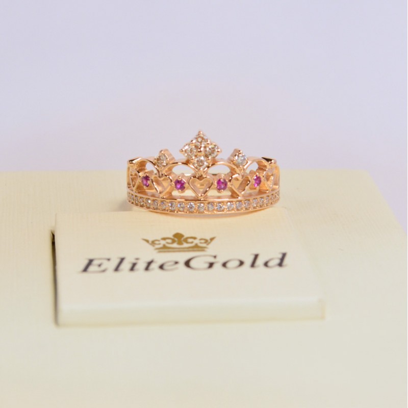 The jewelers of the Elitegold handmade gold jewelry studio offer all princesses and queens a ring in the form of a crown Queen of hearts ring. The undoubted advantage of the product is its shape - the crown. An elegant peak-square, consisting of four round inserts, crowns the entire structure - openwork hearts connected between pebbles. There is also an insert above each heart, which makes the ring royally luxurious and sophisticated. The basis of the composition is a thin bezel, decorated with elegant inserts - a total of 64 stones. The whole ring glitters and shimmers with all the colors of the rainbow, making all women's hearts freeze.