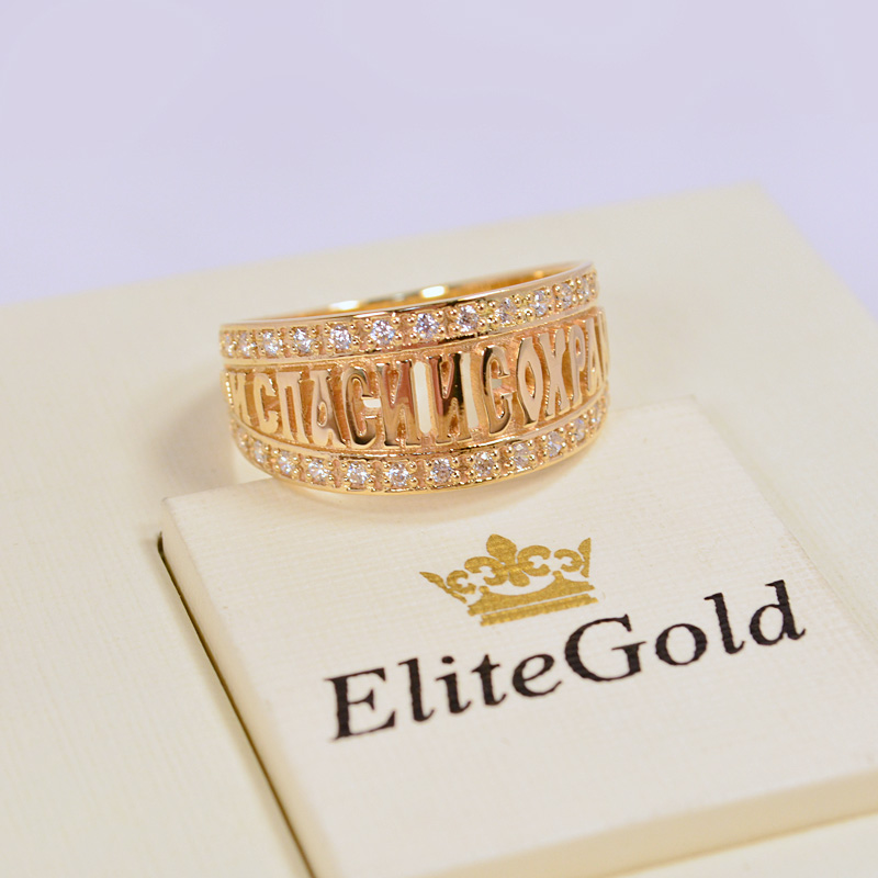 The women's ring from the online store of handmade gold jewelry Elitegold has a convex shape, on the glossy rim of which the inscription "Save and save" is engraved in block capital letters. Above and below it are graceful round inserts (20 pieces each) in faden tacks.