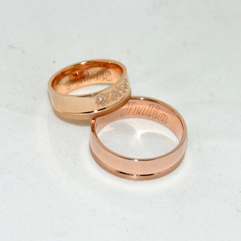 Structurally, the paired handmade Stars wedding rings from Elitegold consist of two articulated rims. The lower rim is the border of the decoration; it is thinner than the top and has a matte structure. The top bezel is glossy. The women's ring differs from the men's by the presence of decor: symbolic stars are engraved on the glossy surface of the rim, decorated with three round inserts (white in the photo). At the request of the couple, your names, wedding date, hearts can be engraved on the inner rim of the ring.
