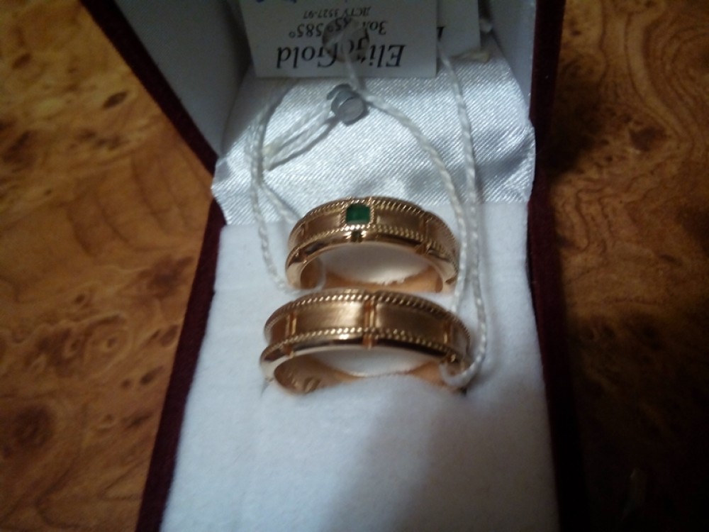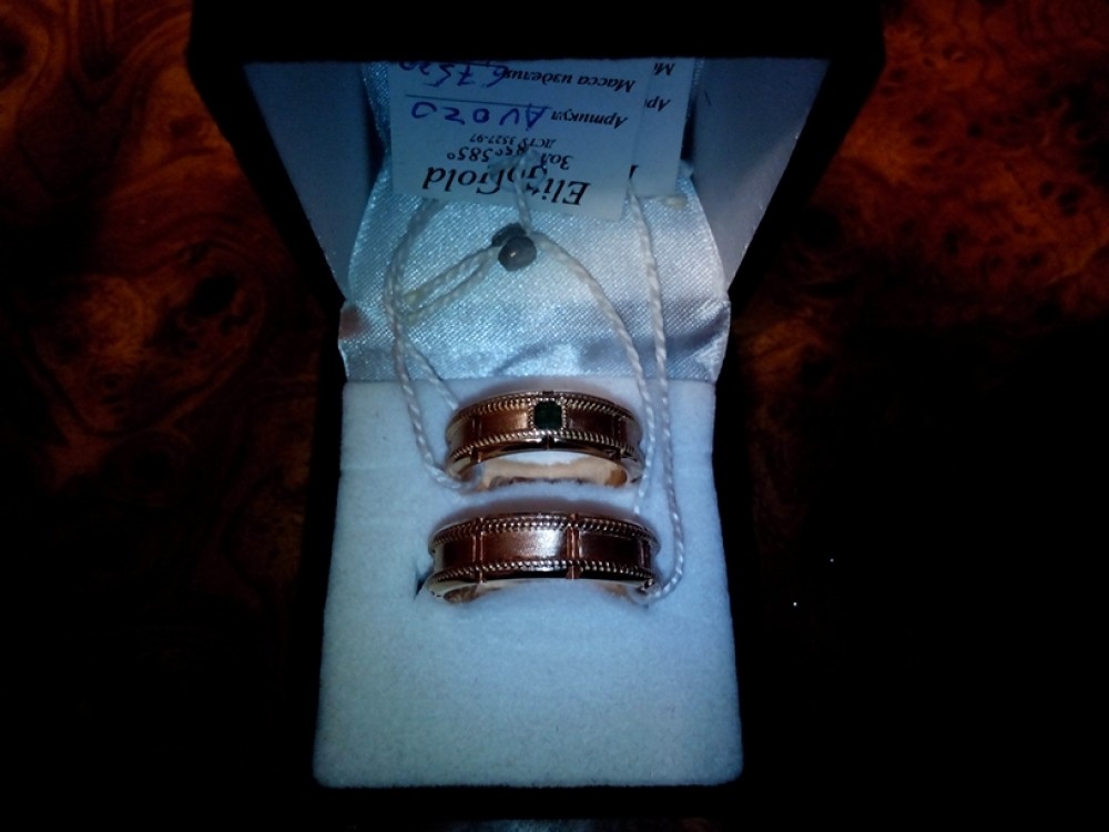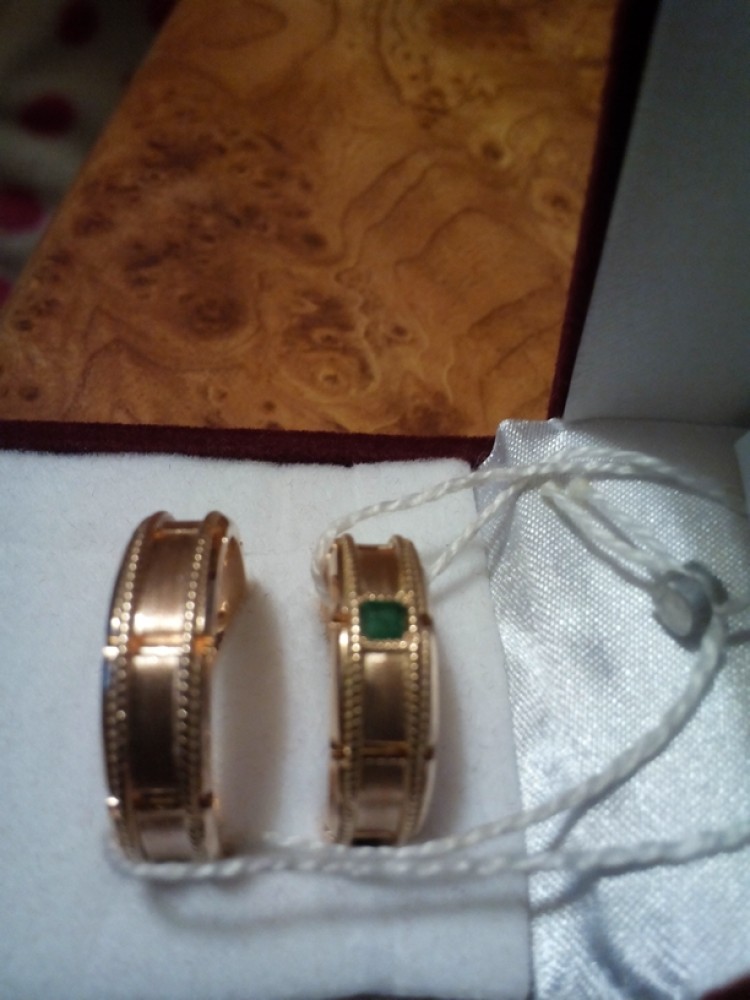 The weight of the female ring is 7.5 g, the male ring is 9.7 g; the width of the female ring is 6.5 mm, the male ring is 7 mm. The color of precious metal and stone can be chosen at your discretion.