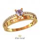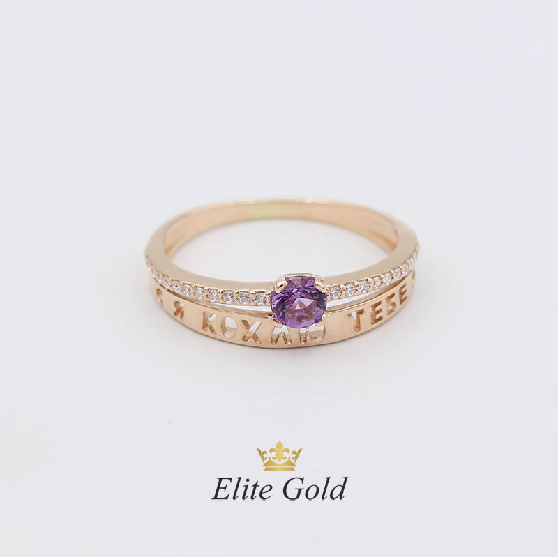 The composition is made of gold with a glossy surface and is a double piece of jewelry with a single rim. The upper part of the ring is a thin rim with a large stone in the center (in the photo - lilac) and white elegant inserts in faden fasteners located on both sides of it (24 pieces). The lower part of the ring is an engraved through inscription “I love you”, at the beginning and at the end of which there are hearts.