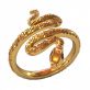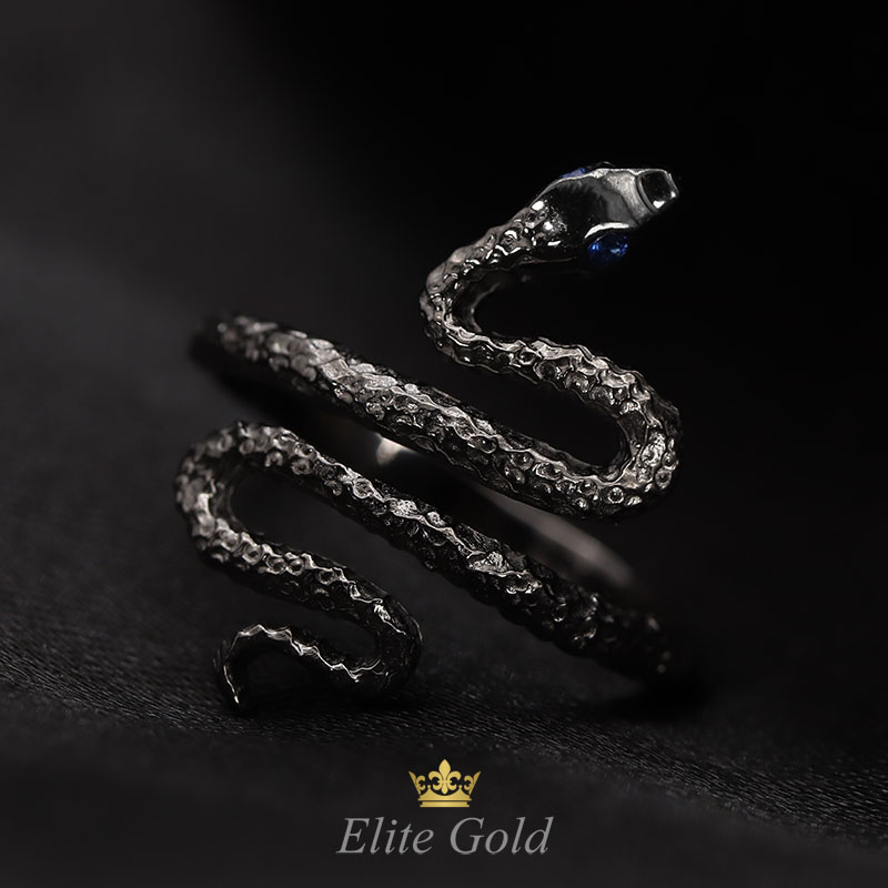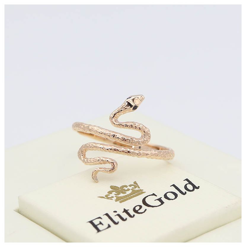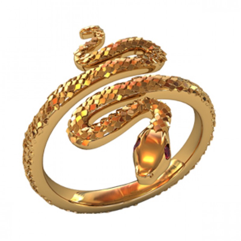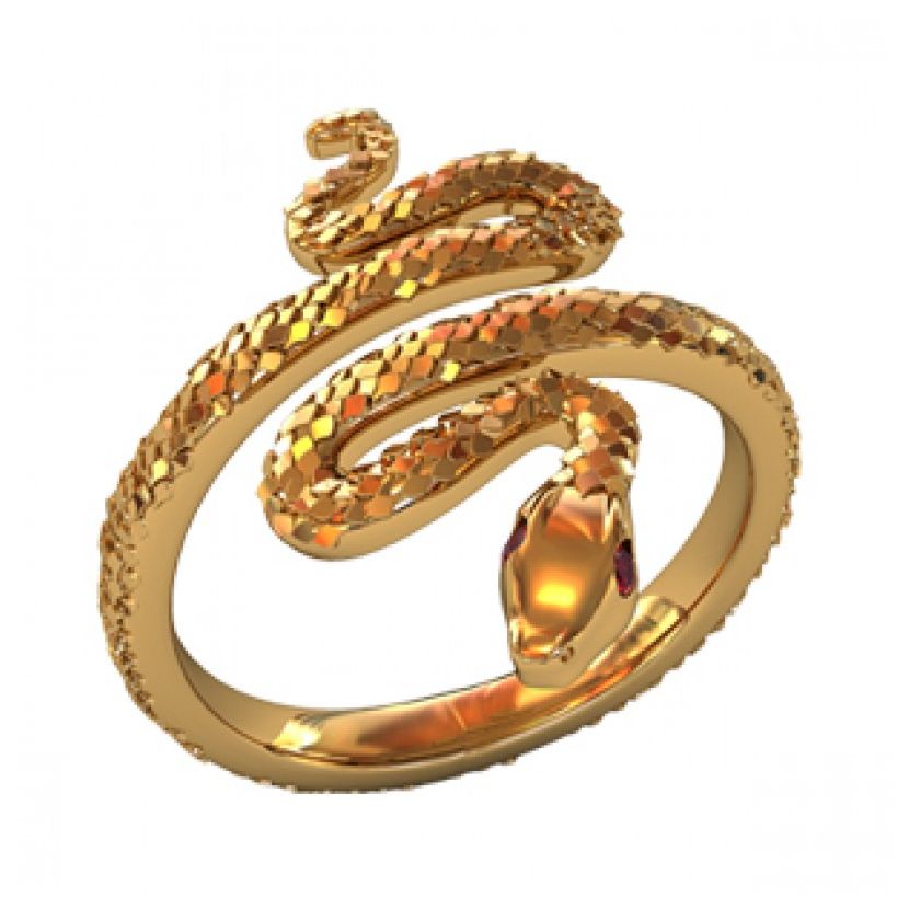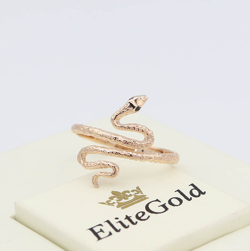 The snake is a symbol of wisdom, lightness and grace. That is why her image is used as an element of tattoos, as well as in jewelry. The jewelers of the Elitegold handmade jewelry studio offer the fair sex a novelty - a ring in the form of a snake. The model is presented in gold with a glossy and embossed surface in the form of a curved open rim imitating the body of a snake. From above, it is covered with golden "scales", the head is decorated with two round green inserts - these are the eyes of our snake. A thin designer ring in the form of a snake has a weight of 2.5 grams, a width of 24 mm.