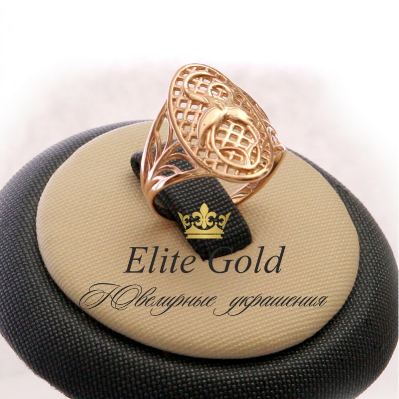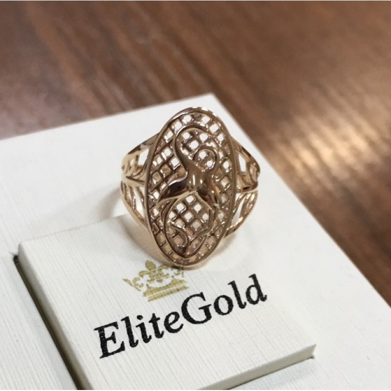 The Stork ring without stones from Elitegold jewelers is a flat oval openwork seal made of gold with a glossy surface. A characteristic feature of the decoration is a mesh inside, with a relief image of two storks applied to it. The wide rim looks original, which is a logical continuation of the conceptual idea of the ring.