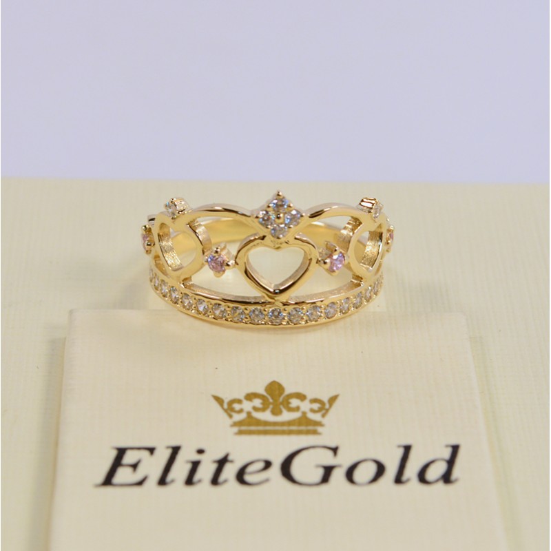 The ring-crown "Amelia" from Elitegold jewelers consists of three openwork hearts connected by graceful round stones in faden setting. The middle heart is crowned with a composition-square of four inserts. There are also stones around the other two hearts. Three golden hearts are connected by two curved thin arches.