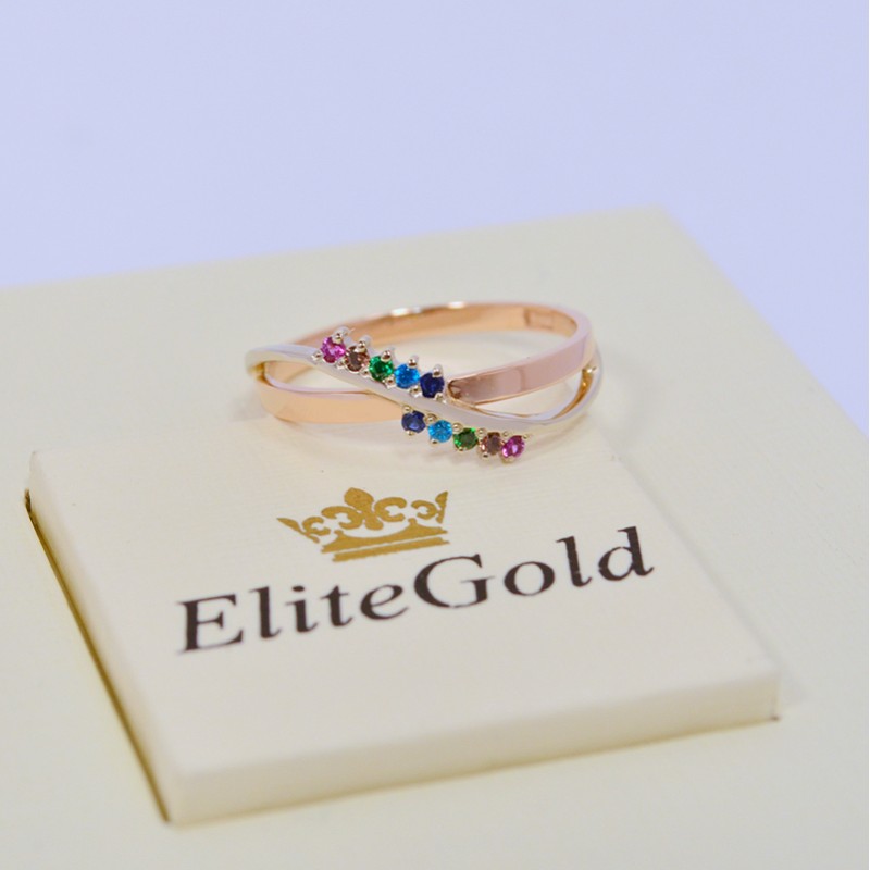 The "Intersections" ring from Elitegold jewelers will appeal to the fair sex, who prefers jewelry made in a classic style. The accessory will be the logical conclusion of a stylish look, it will demonstrate the good taste of its owner. The model is presented in combined gold with a glossy surface. A distinctive feature of the ring is its unusual rim, in the center decorated with a curved plate with miniature stones located above and below (10 pcs.). The bezel and the overlay intersecting it with inserts are made of precious metal of different colors. The weight of the female ring "Intersections" with stones at the top and bottom is 1.6 g, width - 7 mm. Color combinations can be chosen at your discretion.Dimensions & Weight
