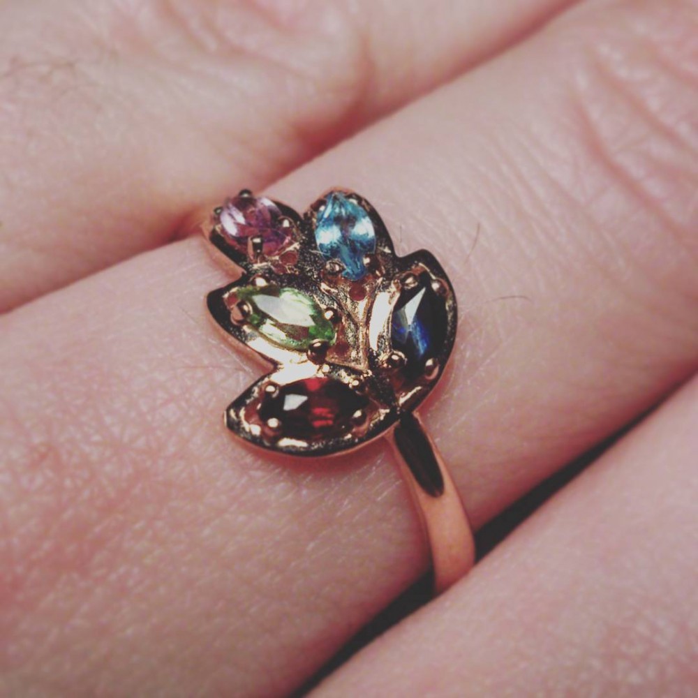 The weight of the female ring in the form of petals with stones is 1.9 g, width - 8 mm. You can choose the color of the stones yourself, based on your aesthetic preferences.