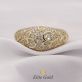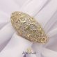 Аксессуар выполнен из драгоценного металла с глянцевой поверхностью. Выпуклый ободок в центре украшен накладкой сверху декорированной изящными белыми вставками круглой формы в фаденовых закрепках (74 шт.). Высокие закрепки и изящные узоры-завитки также являются составными частями ювелирной композиции.