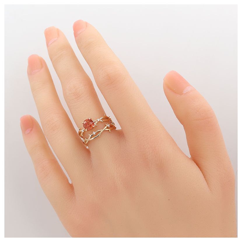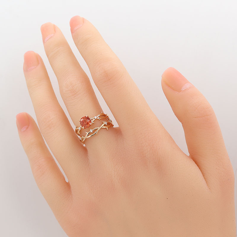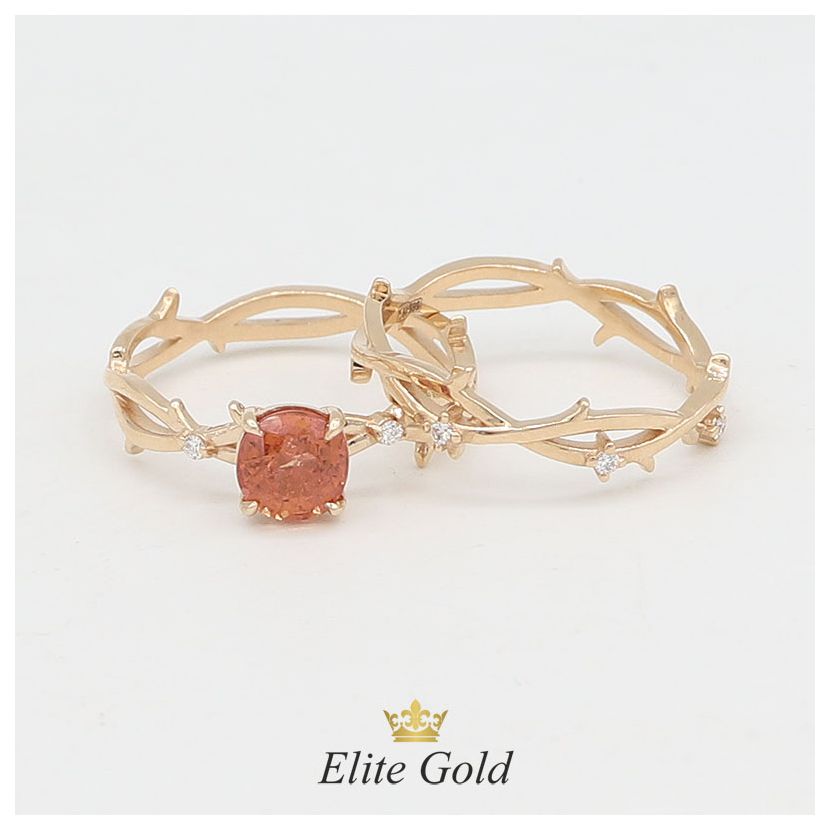 Необычный ободок – это переплетение двух тоненьких ободочков (как в помолвочном, так и в обручальном кольце) выполнен из золота с глянцевой поверхностью и декорирован изящными вставками круглой формы в фаденовых закрепках (по 20 шт.в одном кольце). Более крупный камень такой же формы и цвета расположен в центре помолвочного колечка. Оригинальным дизайнерским приёмом являются небольшие ответвления на ободках. Кольца можно носить как вместе (даже на одном пальце), так и по отдельности.