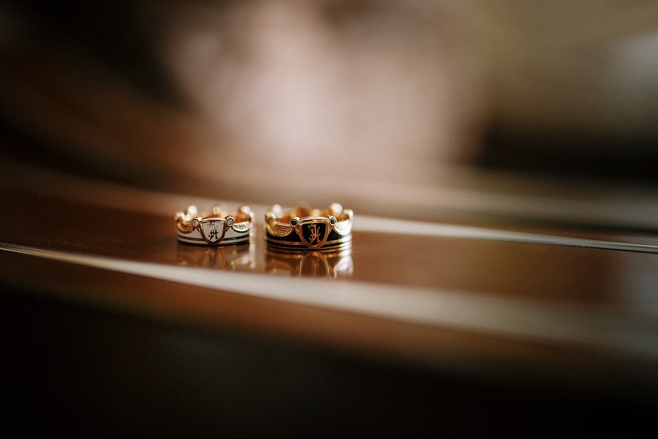 Ðîççèíêîþ ê³ëåöü º ôàì³ëüíèé ãåðá ñ³ì'¿: íà íüîìó âèãðàâ³ðóâàòèìóòü âàø³ ³í³ö³àëè àáî ïåâíèé ñèìâîë ðîäó. Ãîñòð³ âèñòóïè êîðîí³ äåêîðîâàí³ âñòàâêàìè â îáîäêîâèõ çàêð³ïêàõ (ïî 7 øò. ó êîæíîìó âèðîá³). Íà âíóòð³øí³é ñòîðîí³ âèðîá³â ìîæå áóòè âèãðàâ³ðóâàíî äàòó âåñ³ëëÿ.
