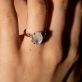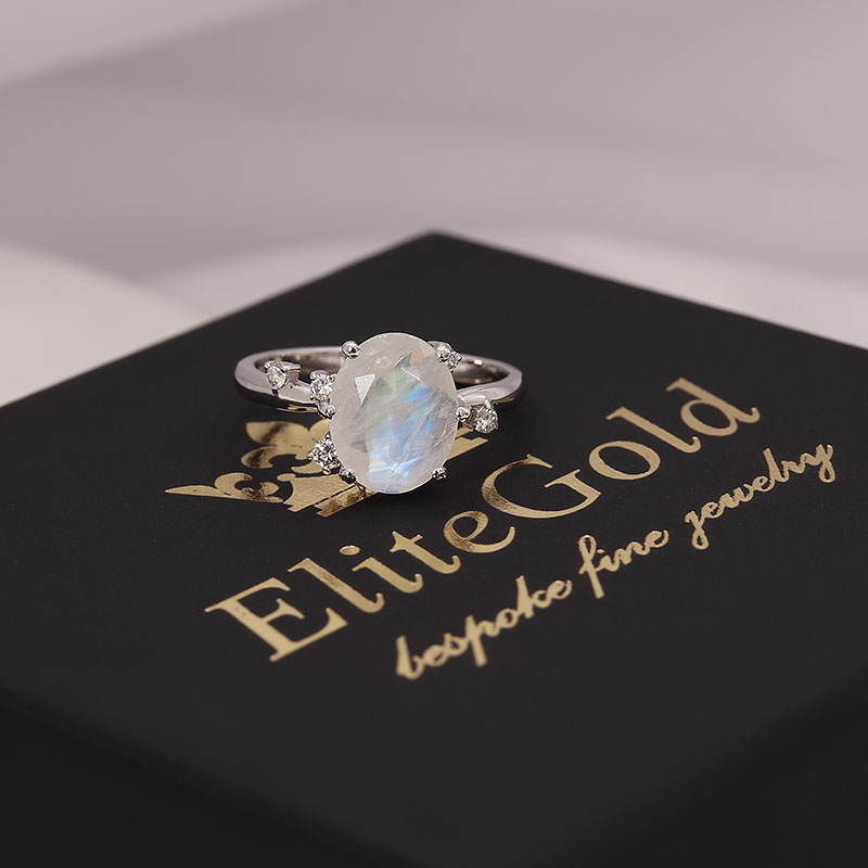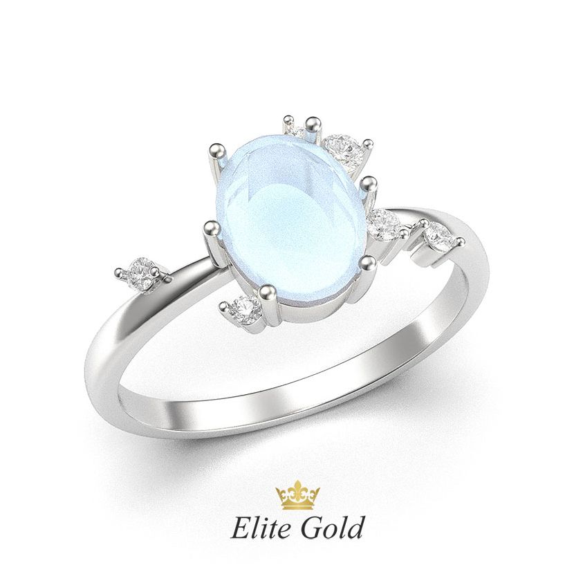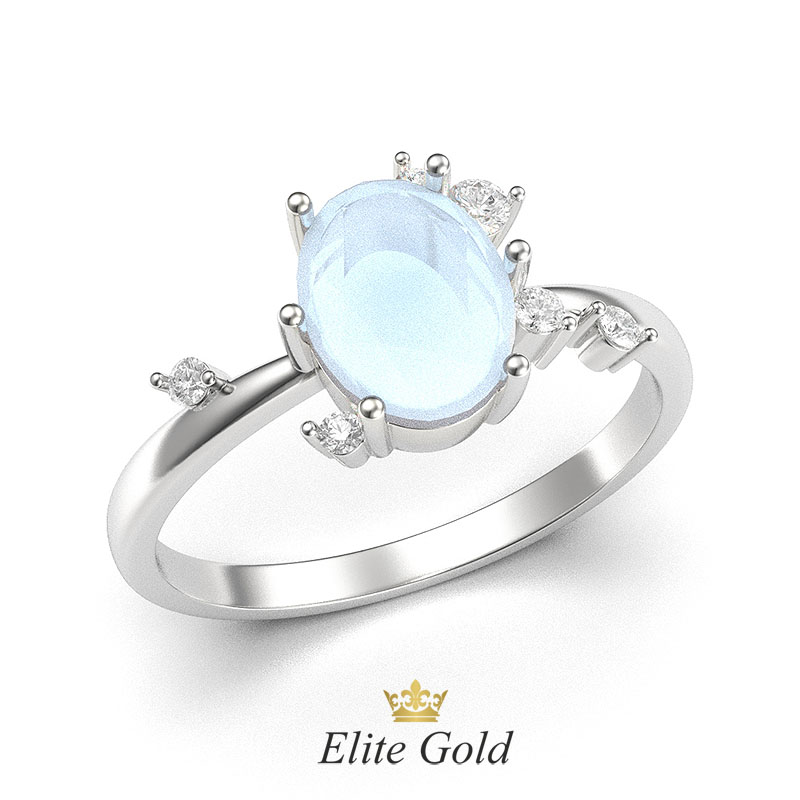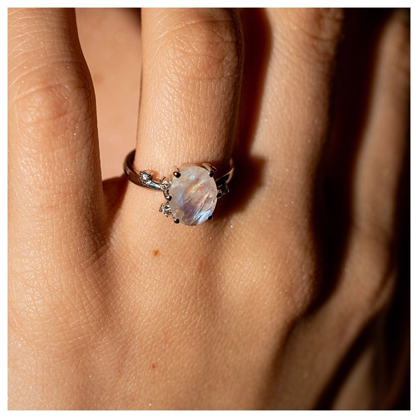 У наявності в шоурумі в 16.5 розмірі, біле золото 585 проби з центральним місячним каменем 1,66 карат, бокові діаманти 0,11 карат I/Si. Можливе індивідуальне замовлення з іншим камінням.