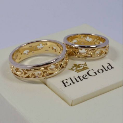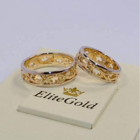 Загальна вага: 14.1 гр / Ширина жіночої обручки: 5.6 мм / Ширина чоловічої обручки: 5.4 мм