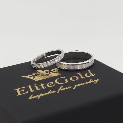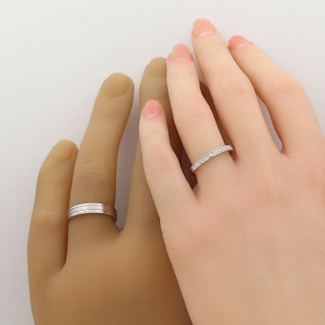 Загальна вага: 8.1 гр / Ширина жіночої обручки: 3 мм / Ширина чоловічої обручки: 5.5 мм