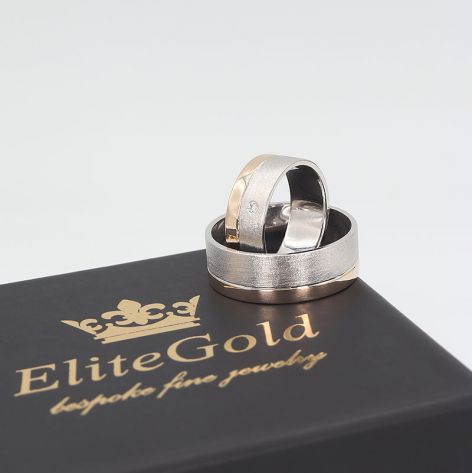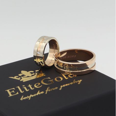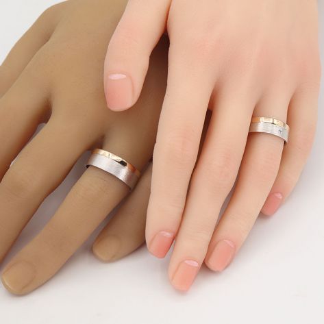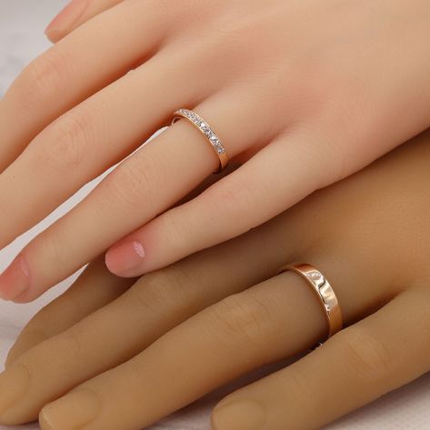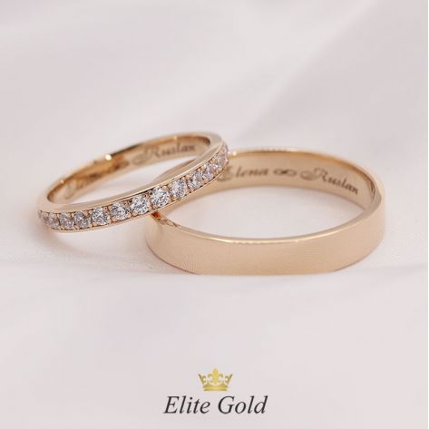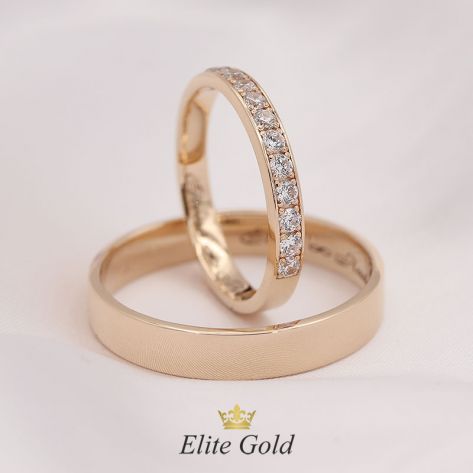 Загальна вага: 11.8 гр / Ширина жіночої обручки: 3 мм / Ширина чоловічої обручки: 4.2 мм