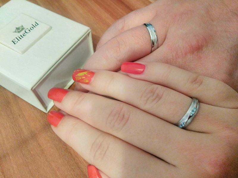 Îñîáëèâ³ñòü òàêîãî ïîºäíàííÿ ïîëÿãຠ⠿õíüîìó äçåðêàëüíîìó â³äîáðàæåíí³ â æ³íî÷îìó òà ÷îëîâ³÷îìó ê³ëüö³. Ó öåíòð³ æ³íî÷îãî ê³ëüöÿ, âèêîíàíîãî ³ç çîëîòà ç ìàòîâîþ ïîâåðõíåþ, çíàõîäèòüñÿ õâèëåïîä³áíèé ðåëüºô ³ç ãëÿíñîâîãî äîðîãîö³ííîãî ìåòàëó. Êîæåí «ãðåá³íü õâèë³» ó æ³íî÷³é ìîäåë³ ïðèêðàøåíèé âñòàâêàìè êðóãëî¿ ôîðìè ó ôàäåíîâèõ çàêð³ïêàõ (çàãàëüíà ê³ëüê³ñòü 9 øò.). ×îëîâ³÷å ê³ëüöå ìຠá³ëüø ëàêîí³÷íèé âèãëÿä - êàì³ííÿ íåìàº.