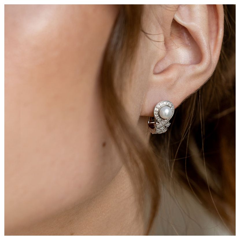 В наявності у шоурумі в 1 екземплярі, перли білі 5 мм, розсип діамантів 0,30 карат, біле золото 585 проби. Можливе індивідуальне замовлення з іншим камінням